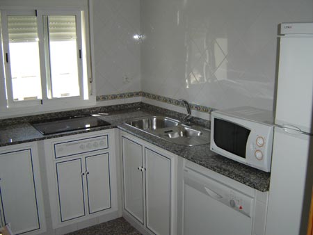 - Cocina con lavavajillas, vitrocerámica, lavadora, frigorífico.