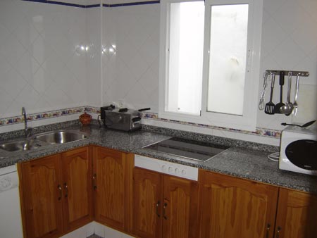 - Cocina con lavavajillas, vitrocerámica, lavadora, frigorífico.